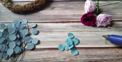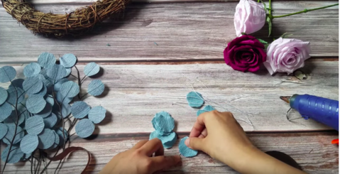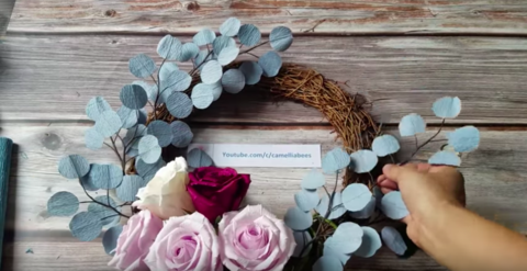 Put the flowers in a corner of the garland, continue to use leaves to cover the leftover parts. And done!