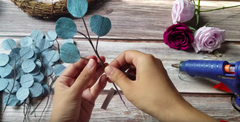 Use floral tape to wrap about 1/3 of the body, then wrap another leaf to continue to form a perfect leaf branch.
