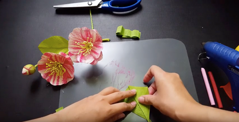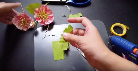 Use small green crepe paper to cut and cut sepals with the head slightly curved, then cover with glue and stick to the flowers.