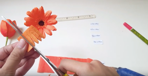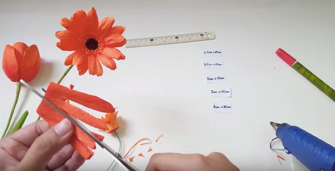 Use crepe paper with darker tones that you have prepared for the largest size (6cmx20cm) to cut petals. Then do the same and paste them into the pistil. Repeat this step to make many petals of paper Gerbera Daisy flower.