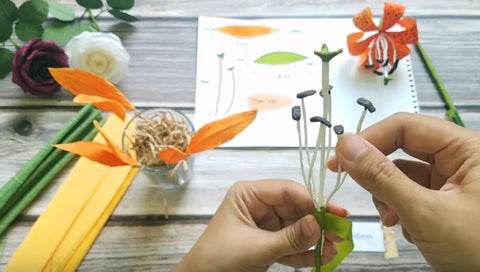 Then use brown floral and white crepe paper to wrap around the floral wire to form the stamens of the paper tiger lily.