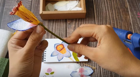 Double the green crepe paper to make a leaf shape and glue it to the trunk of the tree. We have finished a beautiful paper Narcissus Daffodil flower.