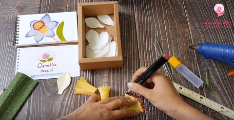 Cut three pieces of yellow crepe paper to make a pistil, then use a brown pen to create a highlight outside the border of the pistil of paper Narcissus Daffodil.